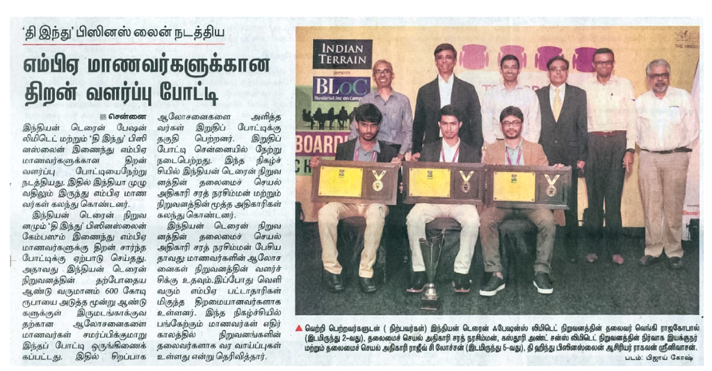 Charath Narasimhan, CEO, Indian Terrain, said: All the teams went beyond case facts and used external data to validate their points and come up with something unique in their ideas. The winning team had thought through the process and had boldly supplemented their reasoning.